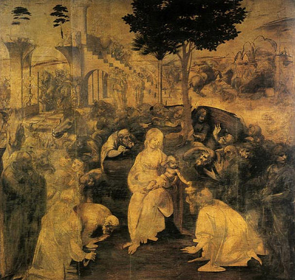 In questa tavola il significato sconvolgente della venuta di Cristo si esprime soprattutto nei moti delle figure, in cui il pittore evoca le forme più intense dell’emozione religiosa, del turbamento interiore e del raccoglimento meditativo. Le architetture in rovina e lo scontro di cavalieri che compaiono sullo sfondo ricordano la parte del mondo che, allo scuro della promessa di salvezza, è schiacciata dal tempo e dalle passioni umane. La concitazione dei moti si placa al centro, dove il piccolo Gesù riceve l’omaggio dei Magi. La preminenza del gruppo centrale si esprime, sul piano formale, nel suo predominio dal punto di vista compositivo: infatti, tutte le direttrici della composizione si ricongiungono al nucleo centrale.