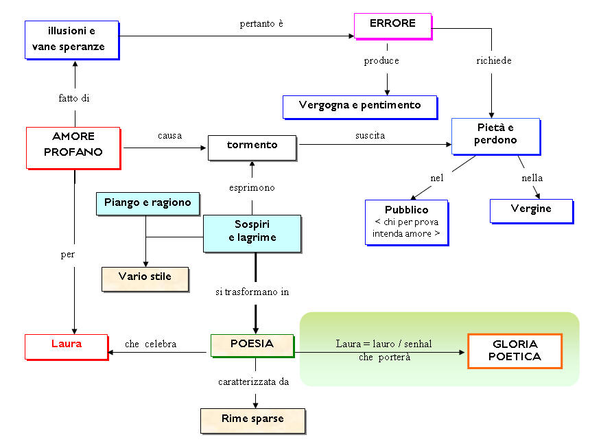 L'idea di gloria poetica č estranea al ripiegamento lirico ed al tono di effusione sentimentale del sonetto proemiale, dal quale emerge piuttosto l'ansia di giustificare un itinerario poetico tormentato. " Petrarca in parte anticipa la conclusione della vicenda d'amore di Laura, pronunciando su di essa un severo giudizio morale, ma facendone anche intravedere la dolcezza " ( M.Santagata) |