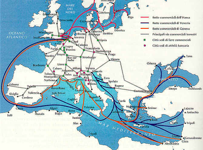 Il cartogramma mostra chiaramente come i circuiti commerciali italiani ed europei che segnarono la fortuna di città e comuni a partire dal XII secolo dipendano strettamente dalle rotte marittime mediterranee, monopolizzate dalle repubbliche marinare italiane. Specificatamente le rotte commerciali veneziane rendono possibile un notevole afflusso di prodotti dal medio e lontano oriente che poi vengono commercializzati lungo la rete urbana che dalla pianura padana arriva fino alle Fiandre. L'altra area funzionale del traffico costiero è data dalle città della Lega anseatica.
