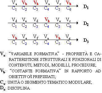 Nello schema seguente si può osservare come alcune variabili formative siano presenti in diversi contenuti, riferiti non solo alla stessa disciplina ma anche a discipline diverse (costanti formative); le variabili formative infatti si può dire che dipendono dalla struttura del contenuto e pertanto vanno ricercate ed opportunamente rilevate per un utilizzo adeguato in un percorso curricolare.